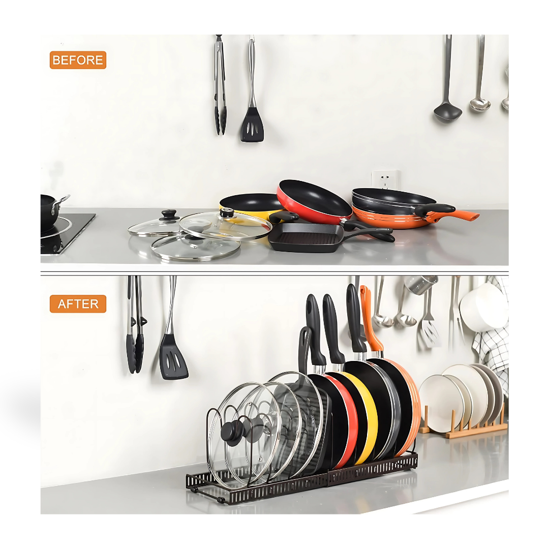 Keep your kitchen clean, organized, and efficient with this adjustable, expandable rack that fits a variety of cookware. Whether you're tight on space or just love a tidy setup, this is your go-to solution.